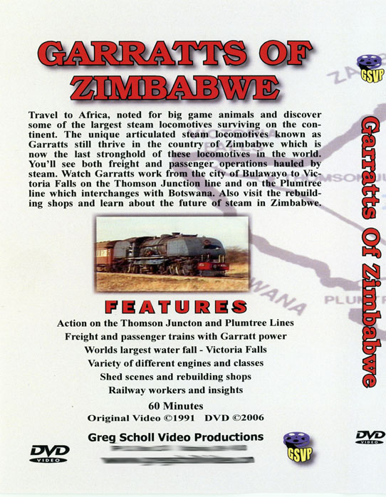 Garratts of Zimbabwe ![]() Click to enlargeNote: Cover image may differ from actual product Travel to Africa, noted for big game animals, and discover some of the largest steam locomotives surviving on the continent. The unique articulated steam locomotives known as "Garratts" still thrive in the country of Zimbabwe, which is now the worlds last stronghold of these interesting locomotives. You'll see 15th Class 4-6-4 + 4-6-4 Garratts, and 20th class 4-8-2 + 2-8-4 Garratts on both freight and passenger trains. Watch Garratts work from the capitol city of Bulawayo to Victoria Falls on the Thomson Junction line and on the Plumtree line which interchanges with Botswana. Also visit the rebuilding shops and learn about the future of steam in Zimbabwe. You'll be treated to activity in the shops as workers rebuild locomotives just like they did in North America 50 years ago. Watch as hot rivets get "pitched" across the shop and land with perfect accuracy for the worker to install them. You'll also hear from the shop foreman, and Dave Putnam, the head of the Bulawayo roundhouse about steam's future. Besides great lineside action, you'll get a short cab ride in a Garratt, see Victoria Falls (World's largest), and see some elephants at one of the popular game parks. This video was shot by Randy Scholl on a 1990 trip to the area. The unique Garratts are awesome machines. |