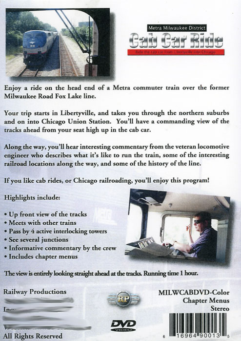 Cab Car Ride is basically a ride in a cab car, as it says. All the way from Libertyville to Chicago's Union Station, the camera always looks straight head. The colour appears to be a bit off, ie... to much green in the trees. Narration is limited, but we are able to hear the conversations in the cab, which is quite interesting. There is not a lot of information about the line or the area, but a few comical stories along the way. Personally, it was not a huge thrill for me, but those fans interested in the greater Chicago area or commuter rail service, it would likely be a fairly good video.