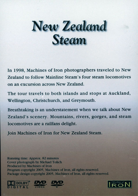 New Zealand Mainline Steam DVD ![]() Click to enlargeNote: Cover image may differ from actual product In 1998, Machines of Iron photographers traveled to New Zealand to follow Mainline Steam's four steam locomotives on an excursion across New Zealand. The tour travels to both islands and stops at Aukland, Wellington, Christchurch, and Greymouth. Breathtaking is an understatement when we talk about New Zealand's scenery. Mountains, rivers, gorges, and steam locomotives are a railfan's delight. Join Machines of Iron for New Zealand Steam. |