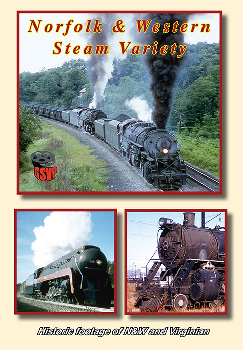 This program is a real variety pack with a lot of diverse subject matter. The first segment is 1953 footage by Victor Shattock where we see 4-8-4 J class number 609 arrive in Lynchburg and he rides it toward the west with several scenes shot out the rear of the Powhaton Arrow. This and the Virginian footage is color 8mm originals. Warren W. Scholl shot the Virginian in the last year or so of steam passenger operations which by this time were down to Roanoke to Norfolk with class 200 series 4-6-2's. We ride a train to Altavista, VA from Roanoke and back. Then we see some switching around Roanoke and visit the roundhouse, before getting a couple of shots in the area of Norfolk and Suffolk with the passenger train. Virginian footage is rare on dvd's as we were told there was only perhaps one other such program available. Virginian was merged into the N&W shortly after this footage was shot. Our next segment is an odd one as its 16mm black and white that looks to be something shot by the railroad, or for the railroad. We begin with engine 612 at Roanoke near the roundhouse, then are riding the train west to Bluefield. This is all shot off the rear of an observation business car of the Powhaton Arrow. Some N&W officials are seen at Bluefield, so we are not sure if this was out-take footage for some testing or what it was. Some of the footage was speeded-up by the cameraman, as he must have been bored, but we slowed it down(its not perfect but its better than wild fast) to close to normal as we could make it. We pass several trains along the way including an M class 4-8-0 on a train at Christiansburg. The final segment of the video is a June 1958 visit to N&W steam country by Perry Becker. This lovely 16mm color footage has lots of meat and potatoes as they say, with passenger trains in steam(the last month steam ran on the passenger trains before leased diesels were used), and freight action. We also visit Shafers Crossing Roundhouse and engine facility where we see all sorts of stuff, including a 2-8-8-2 working the hump. Then its on to Blue Ridge Grade where we see a lot of action around Bonsack, on the west slope of Blue Ridge Grade. We see helpers running light and working as rear pushers. The final shot is a 3-engine train with a Y on the front of a class A(1200), and another Y pushing this coal train. We'll see 2-3 J class engines as well. There are a few scenes west of Roanoke that they shot to and from Roanoke from their home in Minnesota. This is a fast paced show with all this variety.