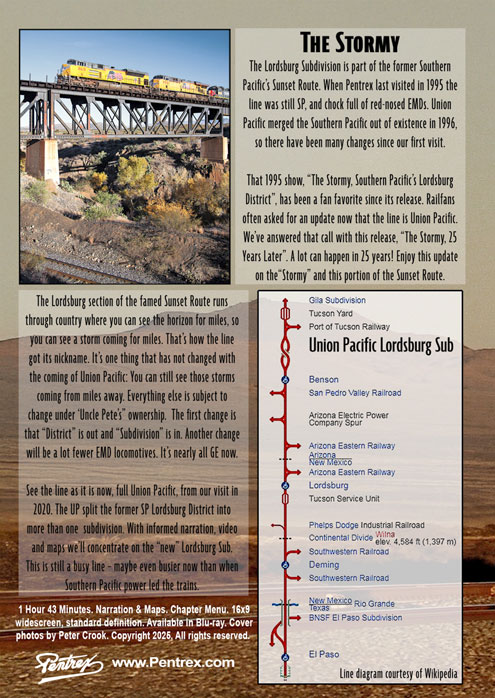 The Lordsburg Subdivision is part of the former Southern Pacific's Sunset Route. When Pentrex last visited in 1995 the line was still SP, and chock full of red-nosed EMDs. Union Pacific merged the Southern Pacific out of existence in 1996, so there have been many changes since our first visit. That 1995 show, "The Stormy, Southern Pacific's Lordsburg District", has been a fan favorite since its release. Railfans often asked for an update now that the line is Union Pacific. We've answered that call with this release, "The Stormy, 25 Years Later". A lot can happen in 25 years! Enjoy this update on the "Stormy" and this portion of the Sunset Route.